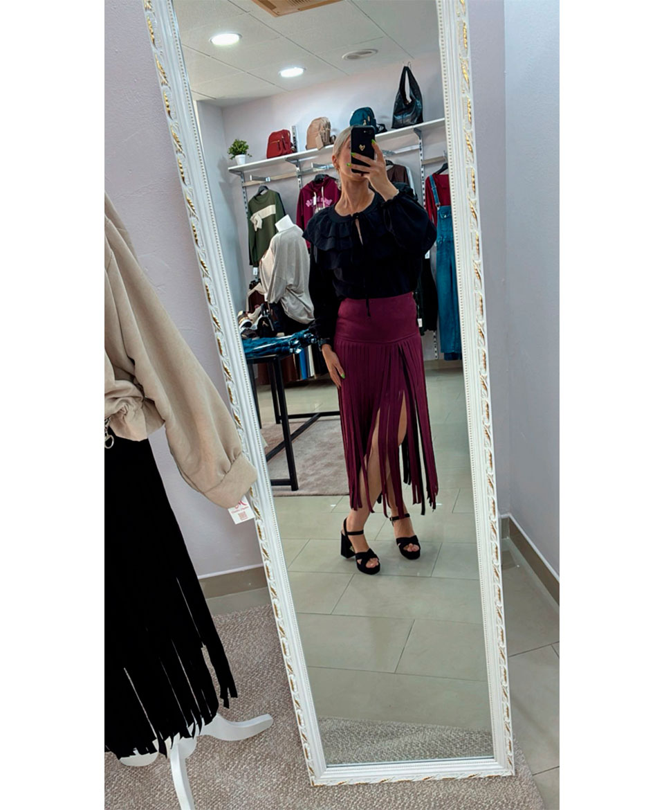 Es una falda de flecos, super en tendencia. Ideal para elevar nuestros looks a otro nivel.